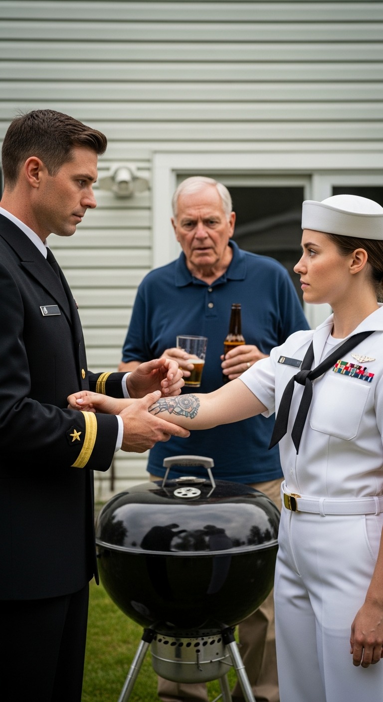 Ik kwam rechtstreeks van een commando-overdracht in Washington D.C., nog steeds in mijn witte uniform omdat ik geen tijd en geen excuus meer had om me te melden. Het uniform was eigenlijk niet geschikt voor een barbecue, maar ik was te moe om me om te kleden en te koppig om me te verstoppen. De zon had het koper op mijn linten veranderd in kleine seintjes. De dag rook naar rook, naar groene dingen en naar de pijn van oude opdrachten.