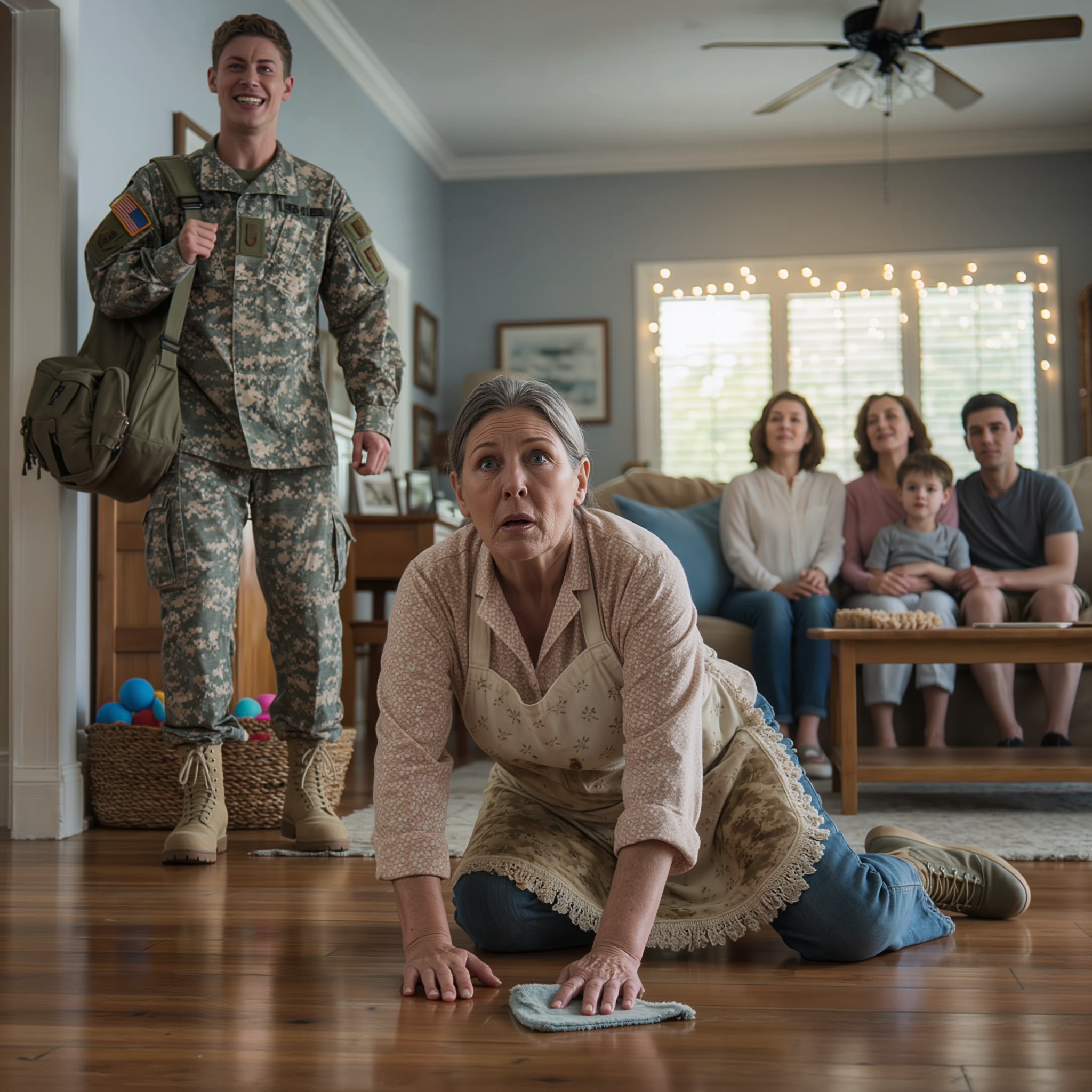 Mijn zoon keerde terug na vijf jaar militaire uitzending en wilde me verrassen. Maar toen hij de deur opendeed, zag hij me als dienstmeisje wonen in het huis dat mijn man en ik hadden gekocht voordat hij overleed. Verward vroeg hij: « Mam, ben jij dit? » Zijn vrouw en haar gezin hadden alles van me afgepakt. Hij stormde de kamer binnen en schreeuwde: « Hier komt nu een einde aan! » Niemand had verwacht wat er daarna zou gebeuren.