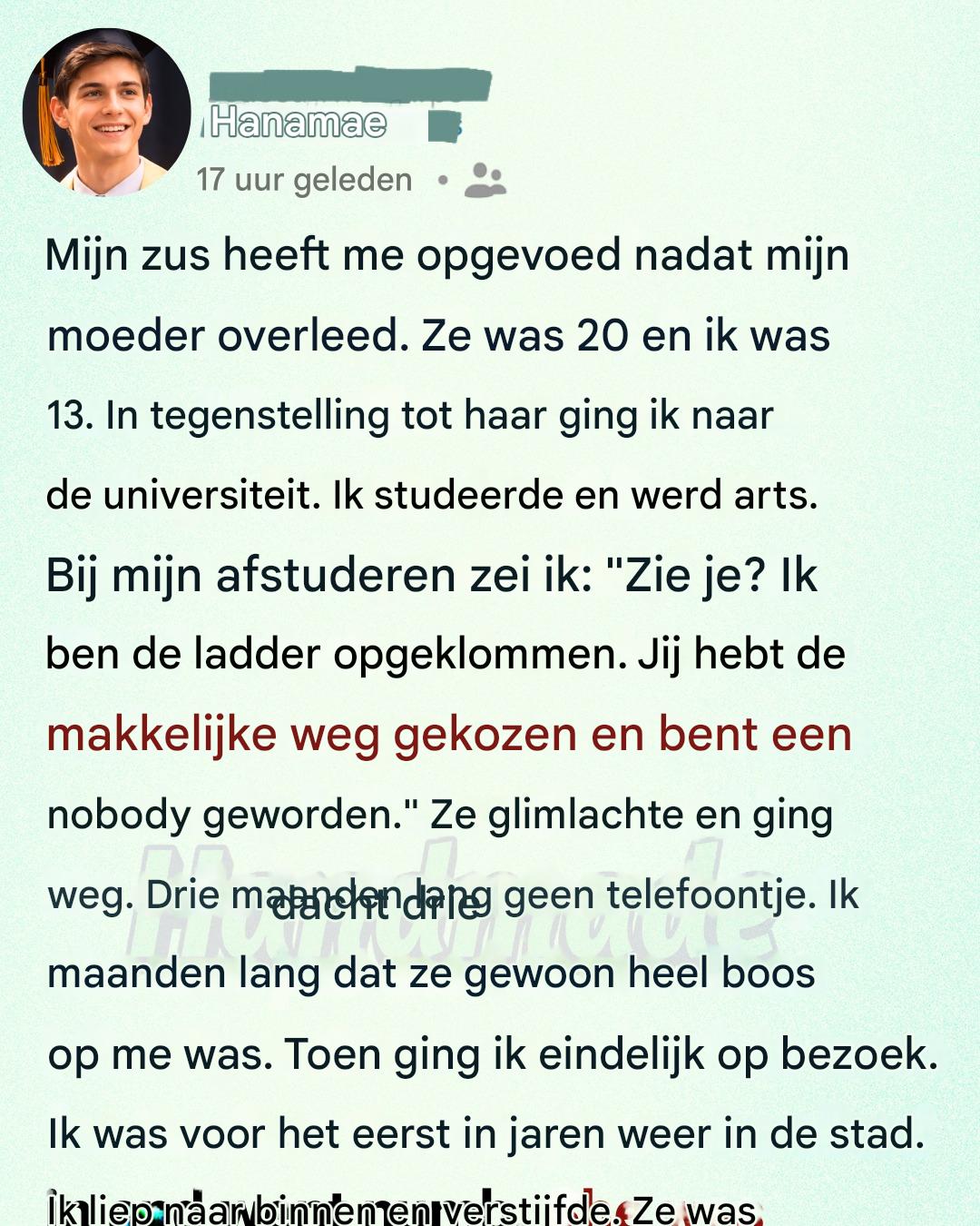 Toen mijn moeder overleed, leek de wereld om me heen in te storten. Ik was pas dertien, te jong om de onomkeerbaarheid van de dood te begrijpen, te jong om het verdriet te dragen dat als een berg op me drukte. Mijn zus, Claire, was twintig. Zelf nauwelijks volwassen, werd ze van de ene op de andere dag mijn voogd. Ze gaf haar eigen dromen, haar eigen jeugd op, om ervoor te zorgen dat ik eten op tafel had, kleren aan mijn lijf en iemand die me eraan herinnerde dat het leven nog steeds geleefd kon worden.