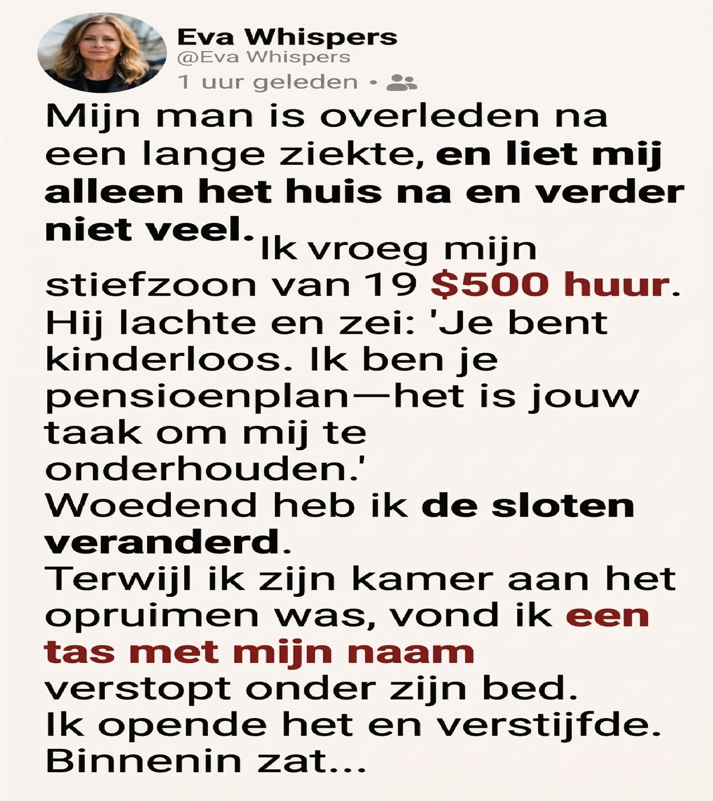 Ik trouwde met mijn man toen zijn zoon nog heel jong was, en hoewel ik nooit heb geprobeerd de plaats van zijn moeder in te nemen, ben ik op de een of andere manier toch haar vervangster in zijn leven geworden. De waarheid is dat hij en ik altijd heel close zijn geweest. Hij stond dichter bij mij dan bij zijn vader, en ik was blij dat hij er was, ook al wist ik dat hij nog maar aan het begin van zijn leven stond en dat hij uiteindelijk het huis uit zou gaan en zijn eigen gezin zou stichten. Maar op dat moment was hij er, en dat was alles wat telde.
