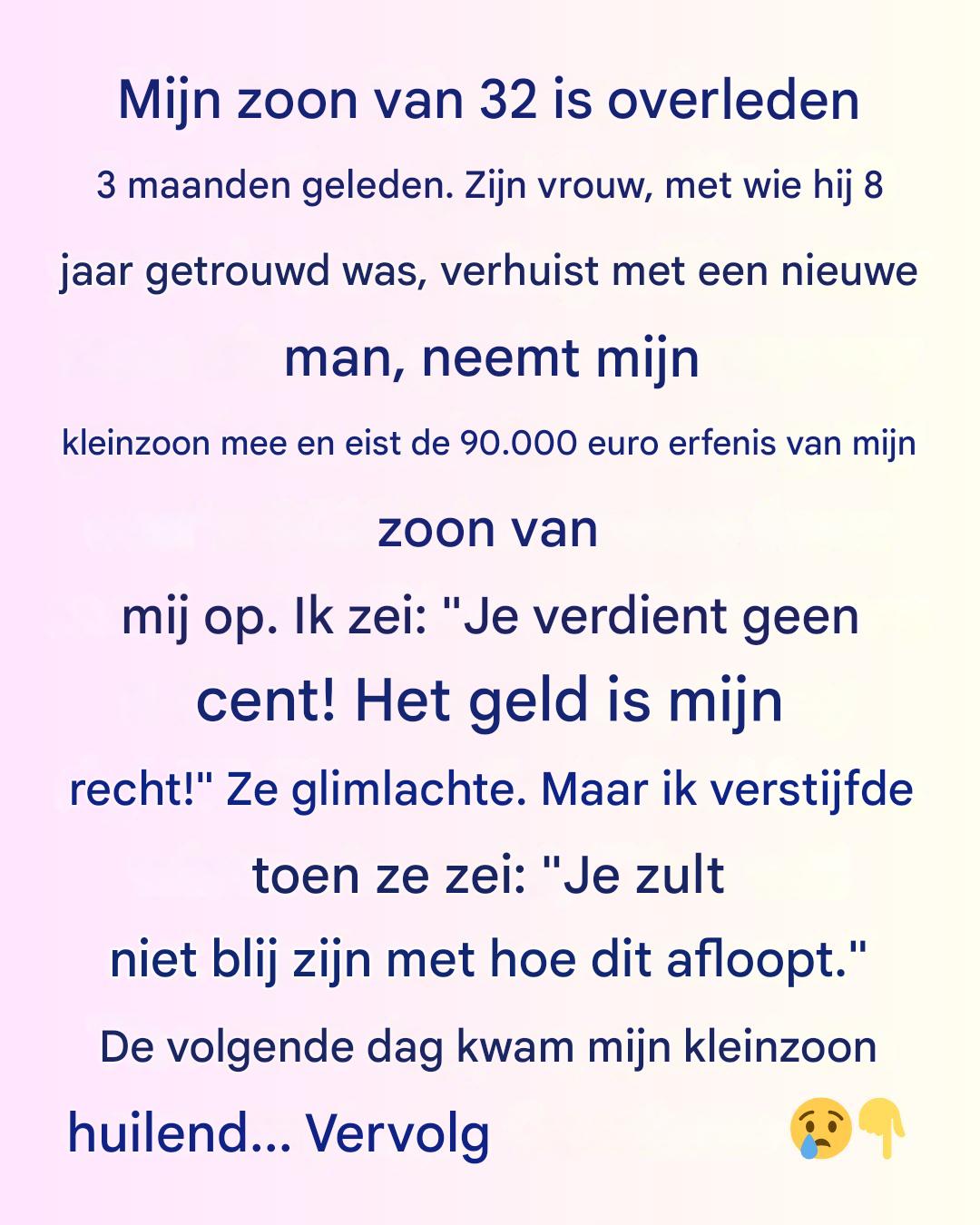 Mijn schoondochter, zijn vrouw van acht jaar, ging opvallend snel verder met haar leven. Voordat ik goed en wel op adem kon komen, kondigde ze aan dat ze een nieuwe man had en met hem naar New York zou verhuizen. Ze eiste ook nog eens de erfenis van mijn zoon van $90.000 op, alsof dat nog niet genoeg was.