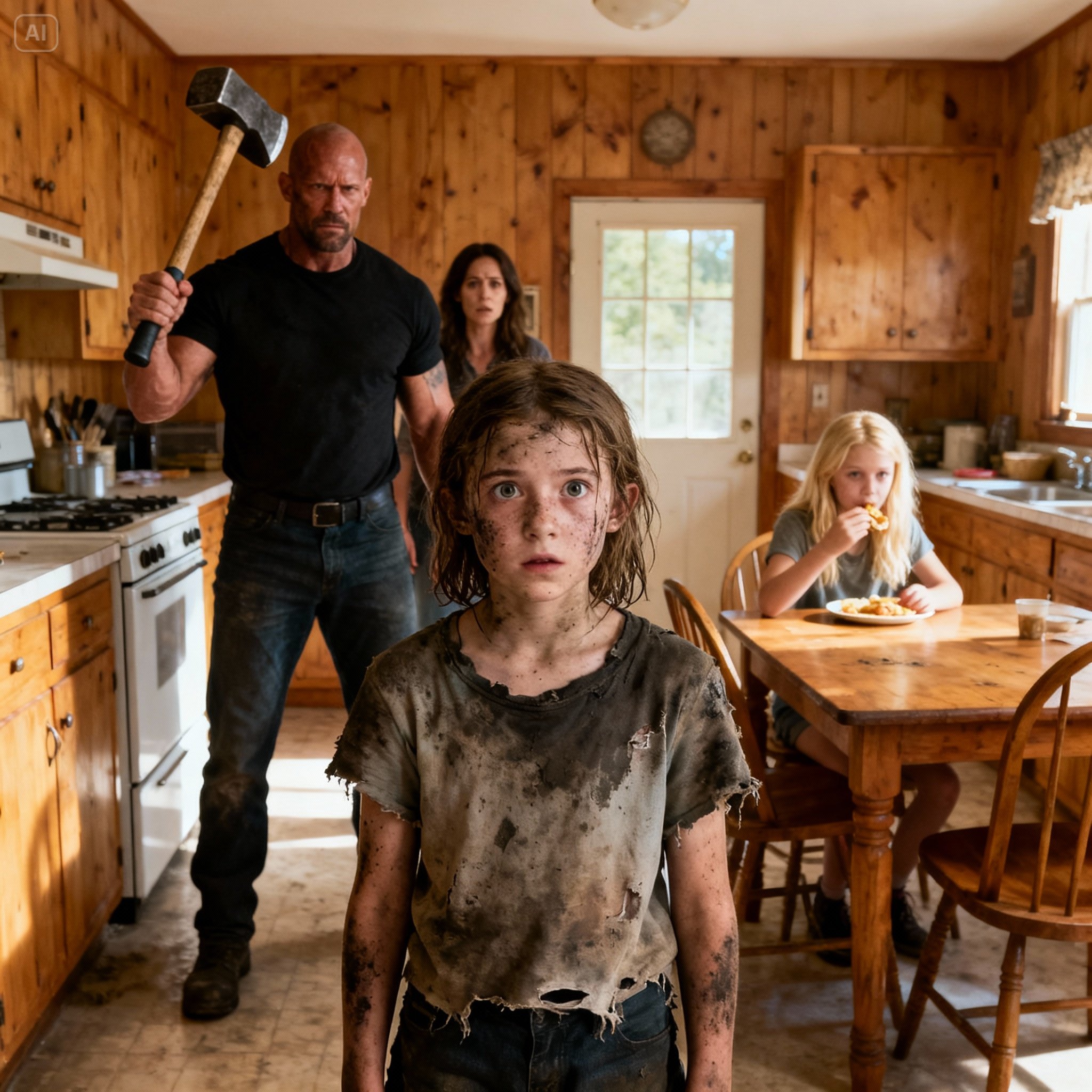 Ik was dertien toen mijn vader mijn vinger verbrijzelde met een hamer. De herinnering begint nog steeds met de geur van biefstuk – knoflookboter, peper, aangebrand vet – die door onze krappe keuken in Indiana zweefde. Mijn zus, Cassidy Hale, zat aan tafel met een bord vol: halfgare biefstuk, geroosterde groenten en warme broodjes. Op mijn bord lag een enkele snee witbrood met een beetje mayonaise.