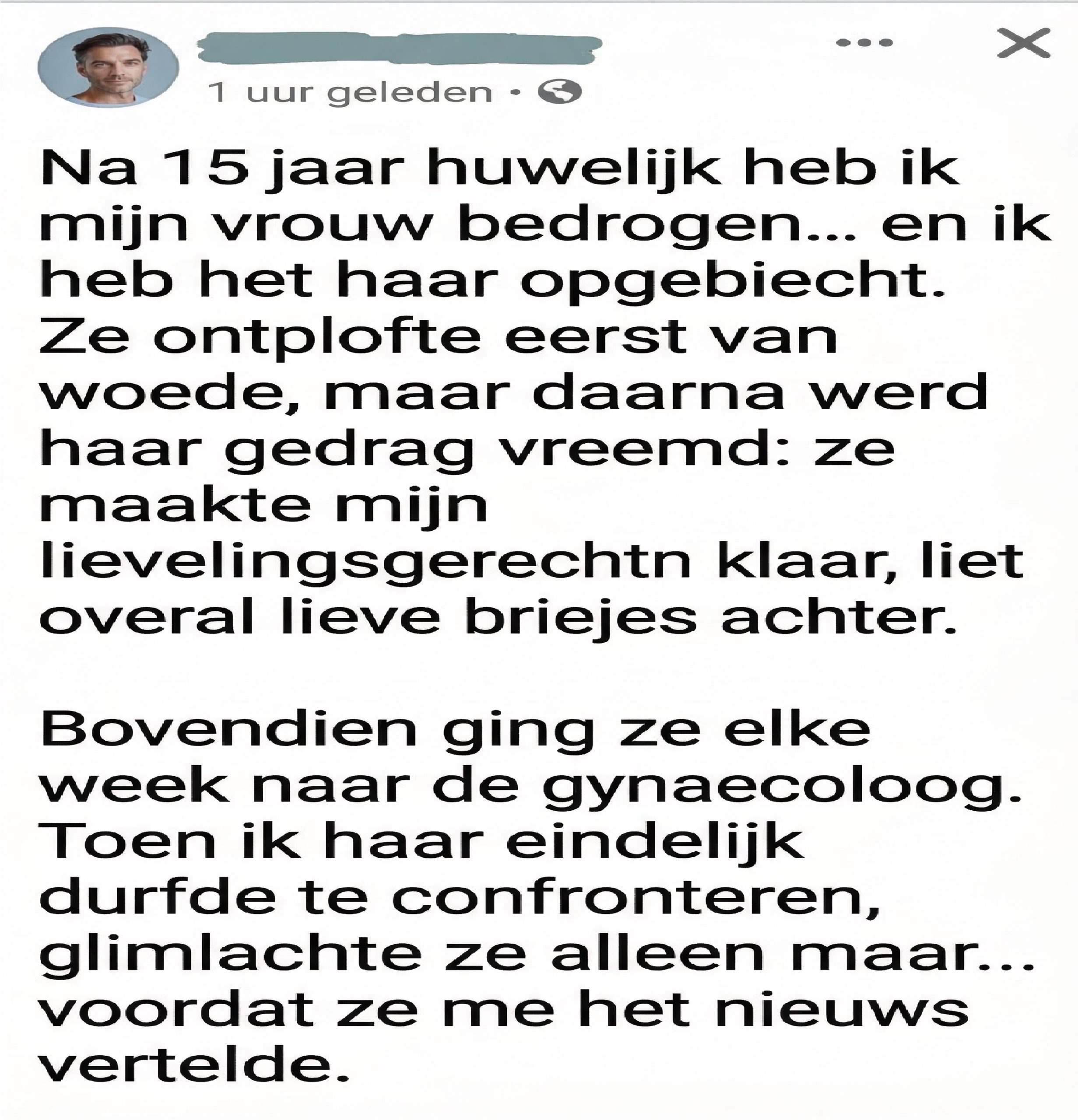Na vijftien jaar samen te zijn geweest, overschreed ik een grens die ik mezelf had voorgenomen nooit te overschrijden. Deze daad schudde de fundamenten van onze relatie. Schaamte overweldigde me lang voordat ik ook maar één woord had uitgesproken: terugkerende slapeloosheid, gebrek aan eetlust, het onvermogen om haar in de ogen te kijken. Elk moment met mijn vrouw was een pijnlijke herinnering aan de realiteit die ik probeerde te onderdrukken, doodsbang om haar voorgoed te kwetsen.