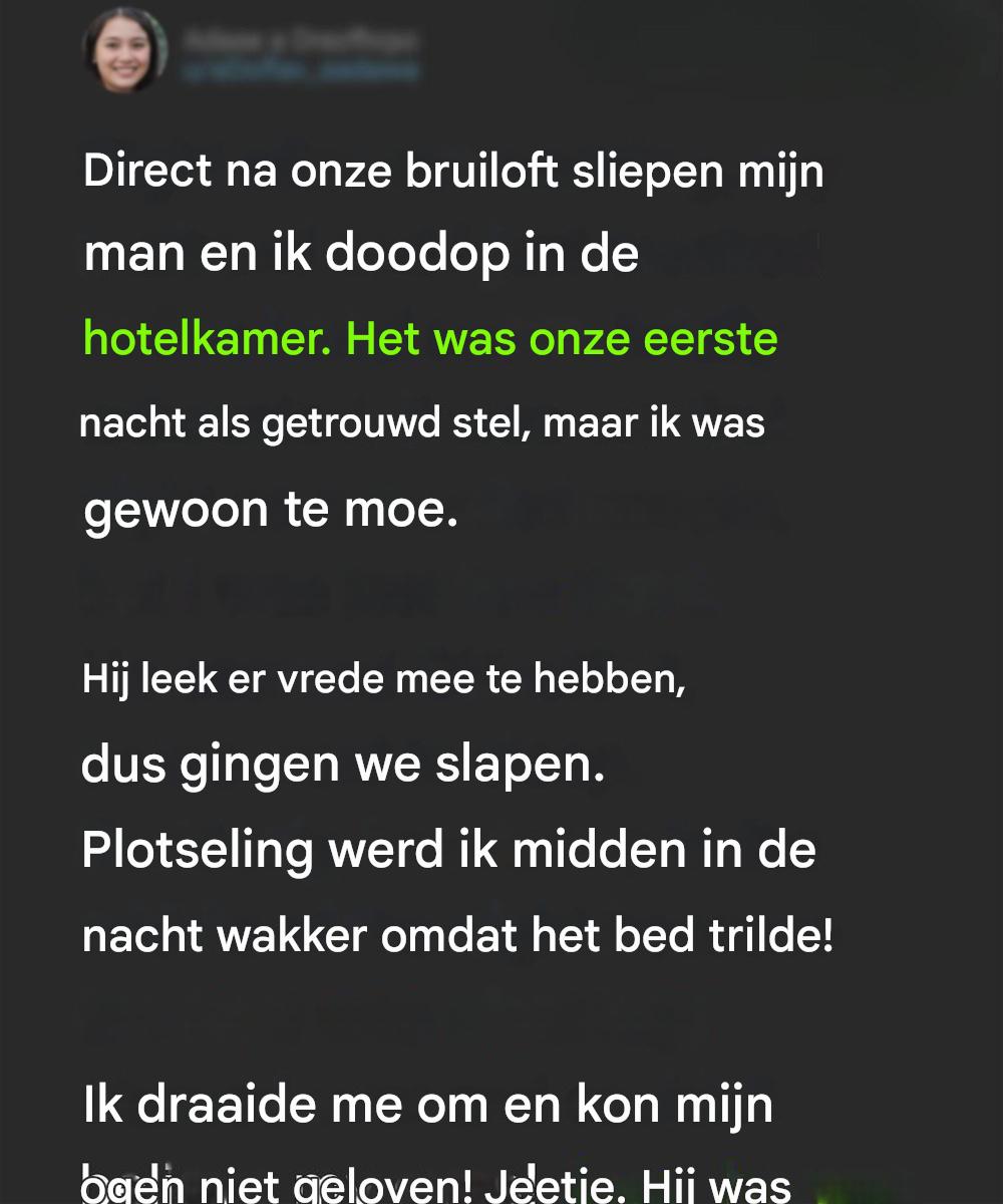 Midden in de nacht werd ik echter wakker en zag ik ons bed schudden.
