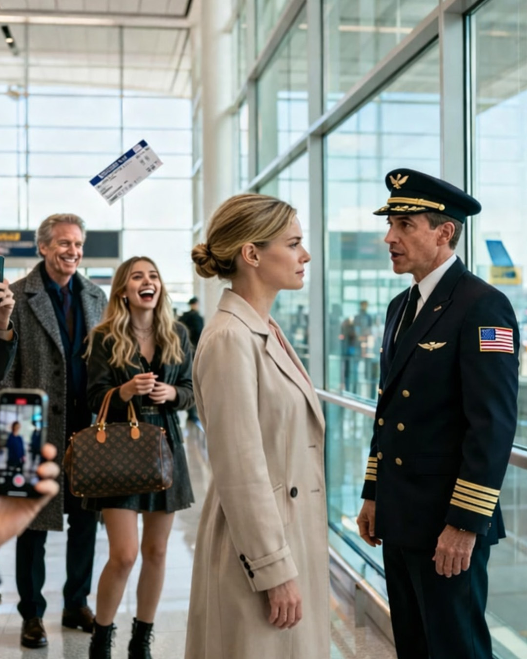 Enkele hoofden draaiden zich om. Enkele telefoons werden omhooggeheven. In Amerika is schaamte een vorm van vermaak, en luchthavens zijn perfecte podia: mensen gevangen, wachtend, kijkend.