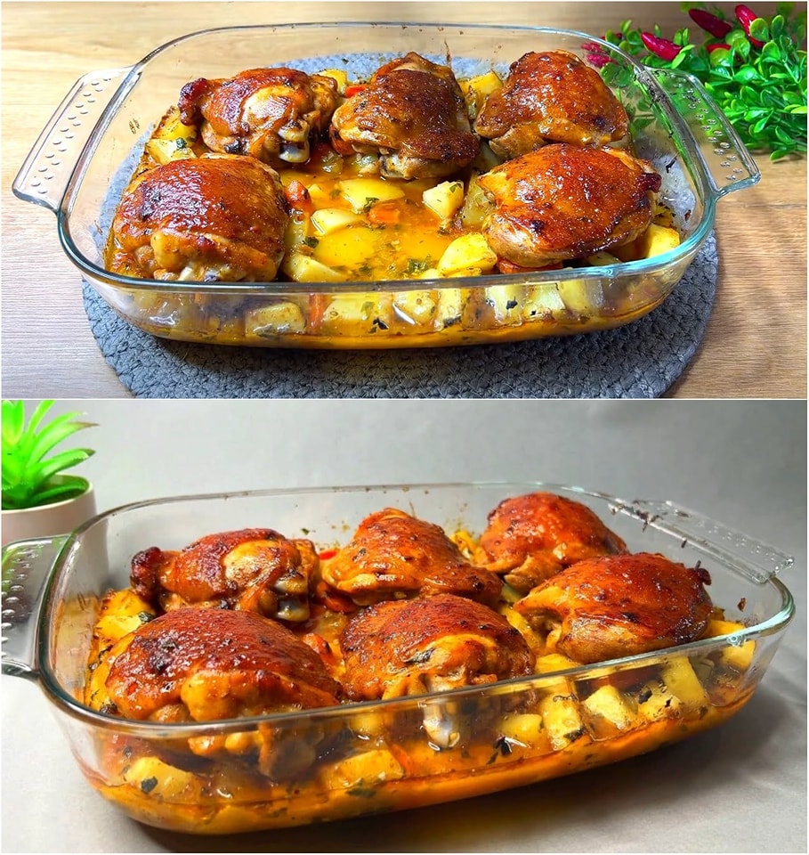 Ingrediënten: 6 kippendijen Zout, peper, paprika aan beide kanten Olijfolie Boter – 15 gram (0,5 ounces) Bak de kippendijen aan beide kanten goudbruin. 1 gesnipperde ui Bruin de ui Wortelen – 200 gram (7 ons) 6 aardappelen – 700 gram (1,5 pond) Zout en peper 3 teentjes knoflook Bund Petersilie