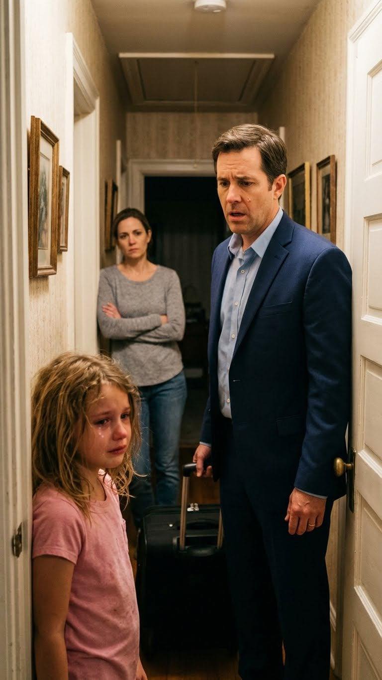 Een hyperrealistische, filmische verticale opname van een gespannen familiescène in een gang.  Op de voorgrond:  een jong Amerikaans meisje met vuilblond haar, gekleed in een roze T-shirt, staat gedeeltelijk achter een wit deurkozijn. Ze kijkt  de man recht in de ogen, met tranen die over haar wangen stromen; ze huilt onbedaarlijk .  Midden:  een Amerikaanse man in een marineblauw colbert en lichtblauw overhemd houdt de handgreep van een zwarte rolkoffer vast en kijkt het meisje aan met een geschokte en bezorgde blik.  Op de achtergrond:  een vrouw in een grijs shirt met lange mouwen en een spijkerbroek staat verder naar achteren in de gang. Ze heeft haar armen over elkaar en  staart het jonge meisje aan met een wantrouwende, alerte en achterdochtige blik , zonder naar de man te kijken. Scherptediepte, warme binnenverlichting, emotionele sfeer, 8K.