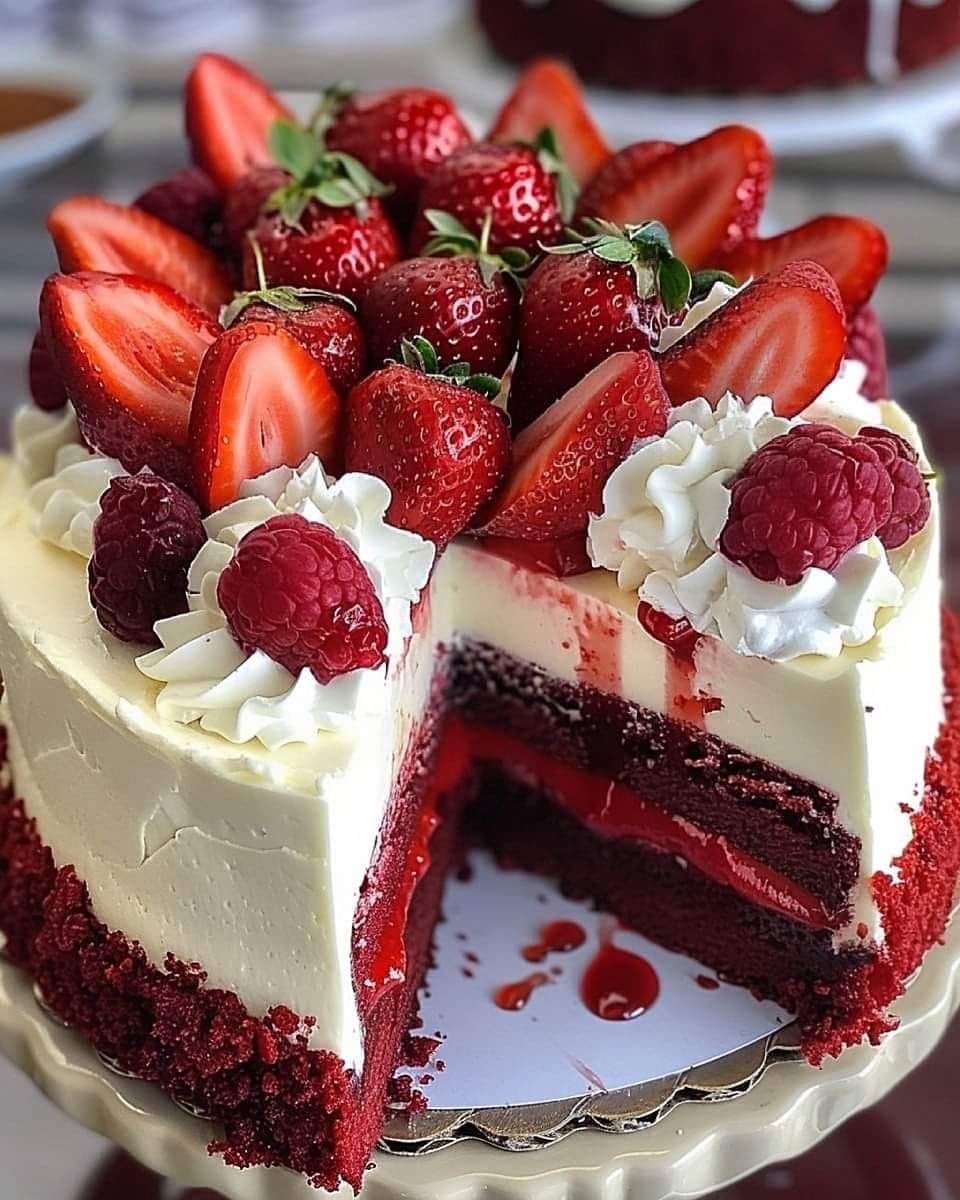 Deze prachtige Red Velvet aardbeien cheesecake combineert de rijke smaak van red velvet cake met de romige textuur van cheesecake en de frisse zoetheid van aardbeien. Het is het perfecte dessert voor een speciale gelegenheid of om jezelf te verwennen met iets extra lekkers.