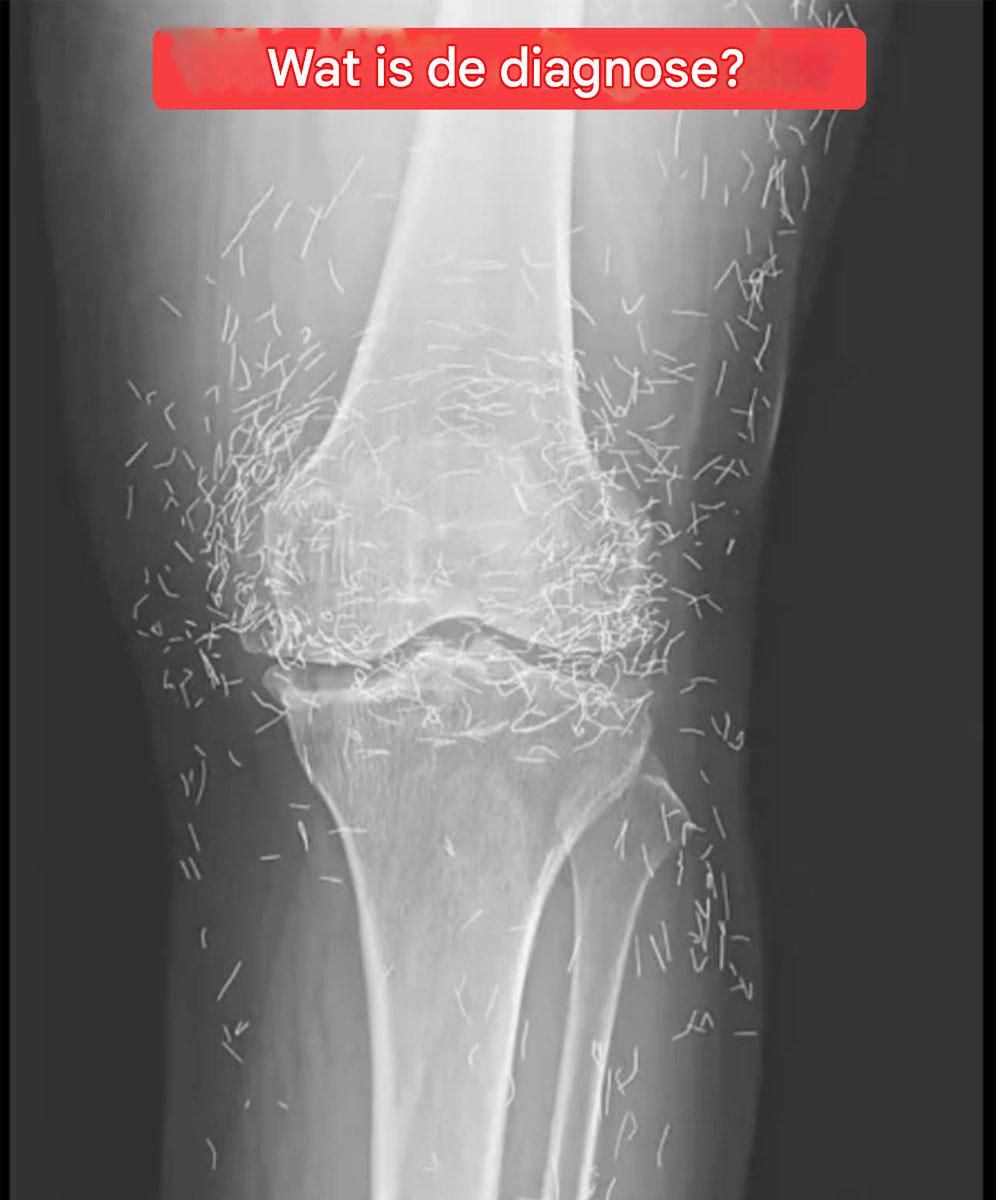 Toen artsen een röntgenfoto van de knieën van een oudere vrouw met ernstige gewrichtspijn onderzochten, ontdekten ze een goudmijn: honderden kleine gouden acupunctuurnaaldjes die in haar weefsel waren achtergebleven.