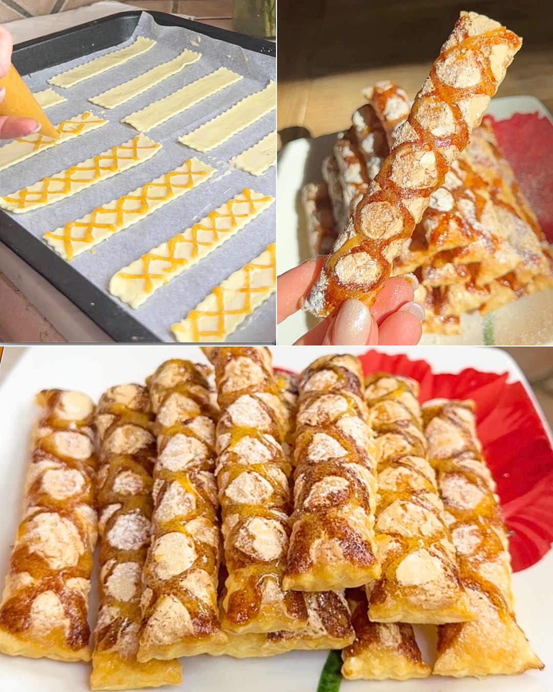 2. Snijd het bladerdeeg eerst doormidden en vervolgens in reepjes van ongeveer 2 cm breed.