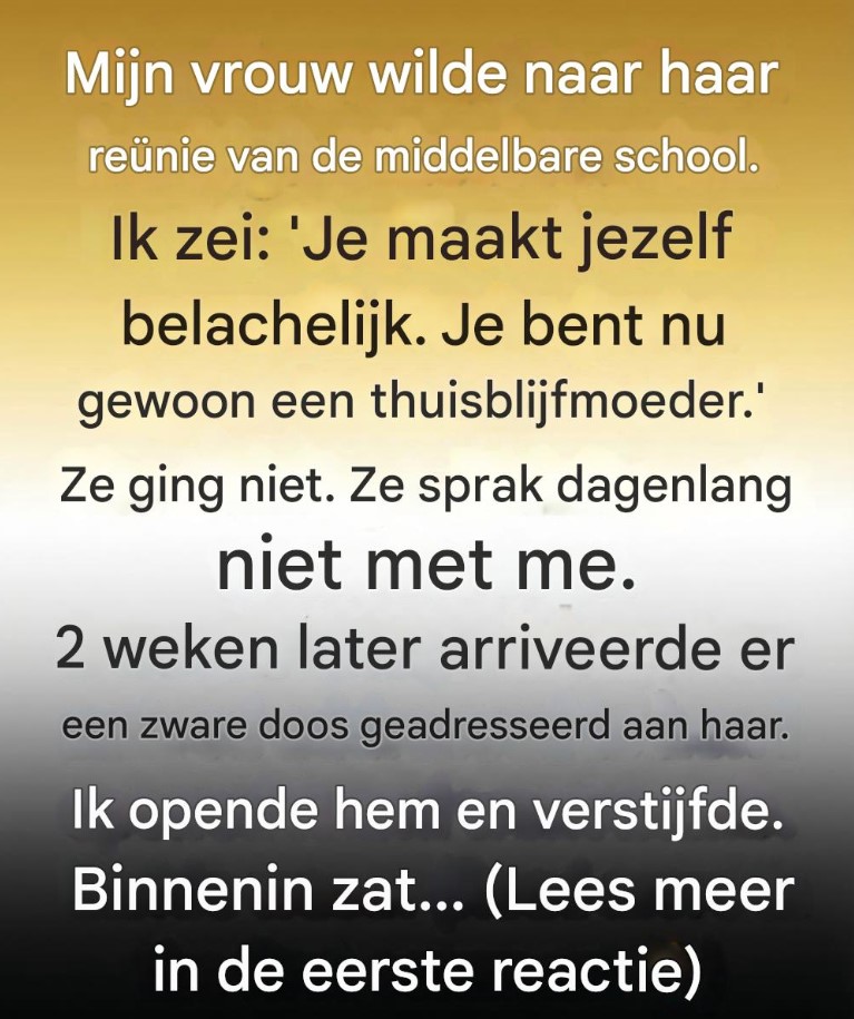 De avond dat mijn vrouw haar reünie van de middelbare school ter sprake bracht, had ik niet eens de fatsoenlijkheid om mijn telefoon weg te leggen. Ik zat door mijn werkmails te scrollen, verdiept in het zelfingenomen gezoem van mijn eigen carrière, terwijl zij in de deuropening van de keuken stond. Het licht van de plafondlamp ving de rand van de crèmekleurige uitnodiging in haar hand op. Er was een hoopvolle, flikkerende zachtheid in haar glimlach – het soort blik dat iemand heeft wanneer ze je een stukje van haar hart aanbiedt en wacht om te zien of je er op zult trappen.