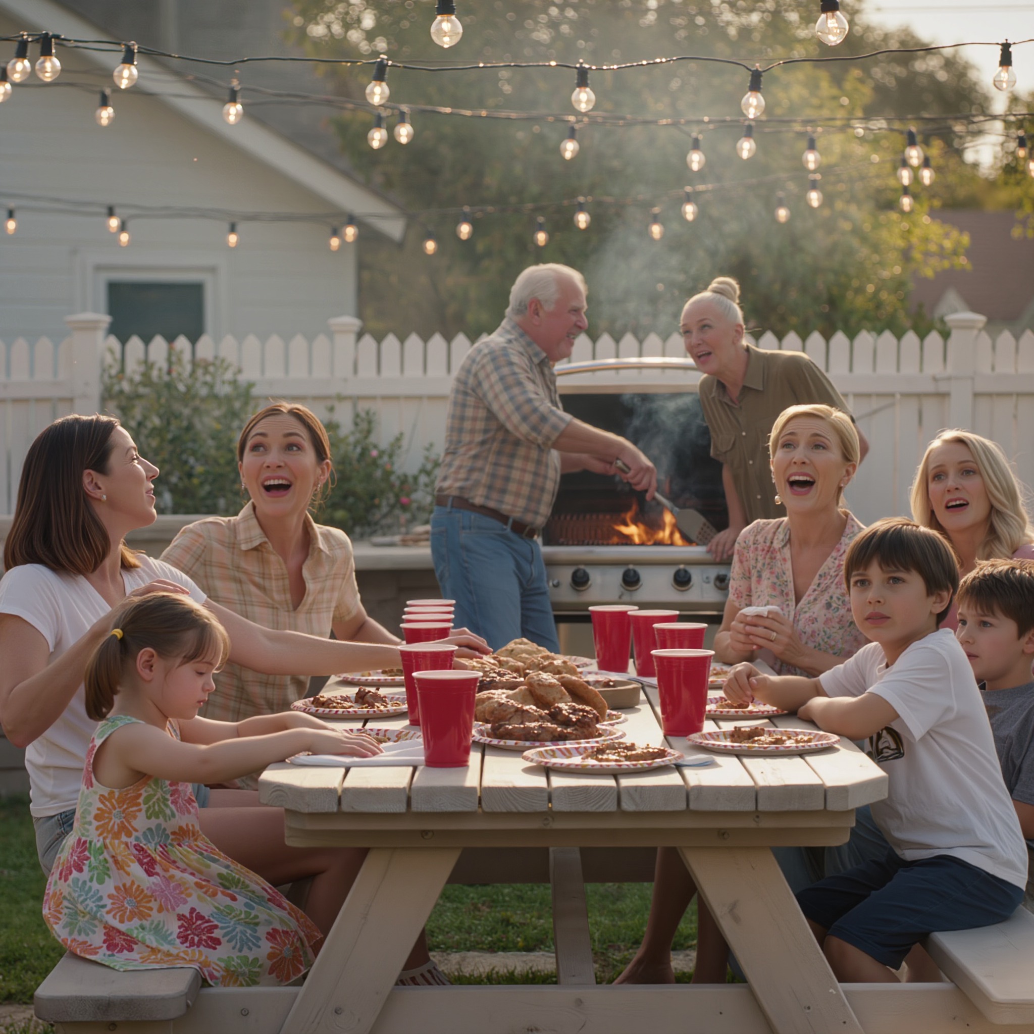 De rook van de barbecue dreef door de achtertuin van mijn ouders, terwijl Emma naast me zat en zorgvuldig haar hamburger in precieze vierkantjes sneed.