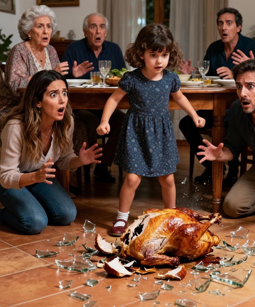Plotseling slaakte Sofía een schelle gil die door de lucht sneed. Ze sprong op, rende naar de tafel en duwde, met een verrassende kracht voor haar postuur, de hele kalkoen op de grond. De klap was hard. Het bord spatte in stukken. Een diepe stilte viel als een zware deken over de familie. Niemand reageerde aanvankelijk. Elena, de grootmoeder, greep naar haar borst. Carlos, de oom, stond daar met zijn vork in de lucht.