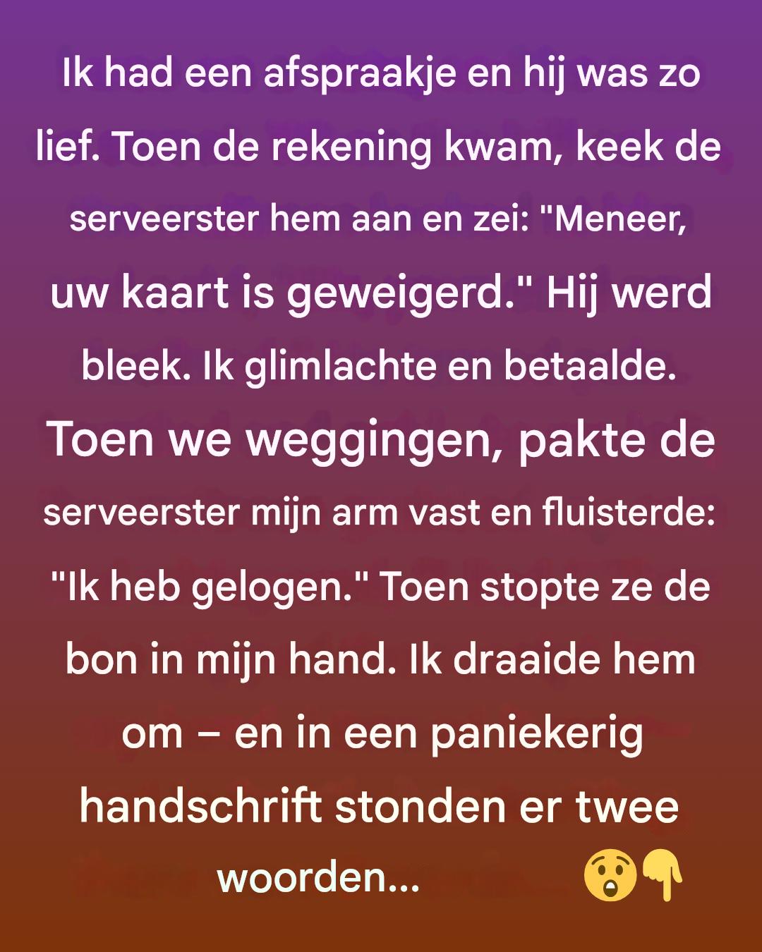 Terwijl ik op een afspraakje was, kwam de rekening en de serveerster zei zachtjes: « Meneer, uw kaart is geweigerd. »