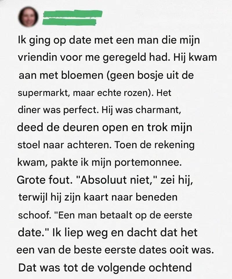 De volgende ochtend werd ik wakker met een bericht van Eric, in de verwachting een vriendelijk berichtje te krijgen. In plaats daarvan stuurde hij een speelse maar onverwachte ‘factuur’ met de bloemen, het cadeau en zelfs het openen van de autodeur als ‘datediensten’, aangevuld met humoristische ‘kosten’ zoals complimenten en een gegarandeerde tweede date. Hoewel het als grap bedoeld leek, voelden sommige delen een beetje te serieus aan, waardoor ik niet goed wist hoe ik moest reageren.