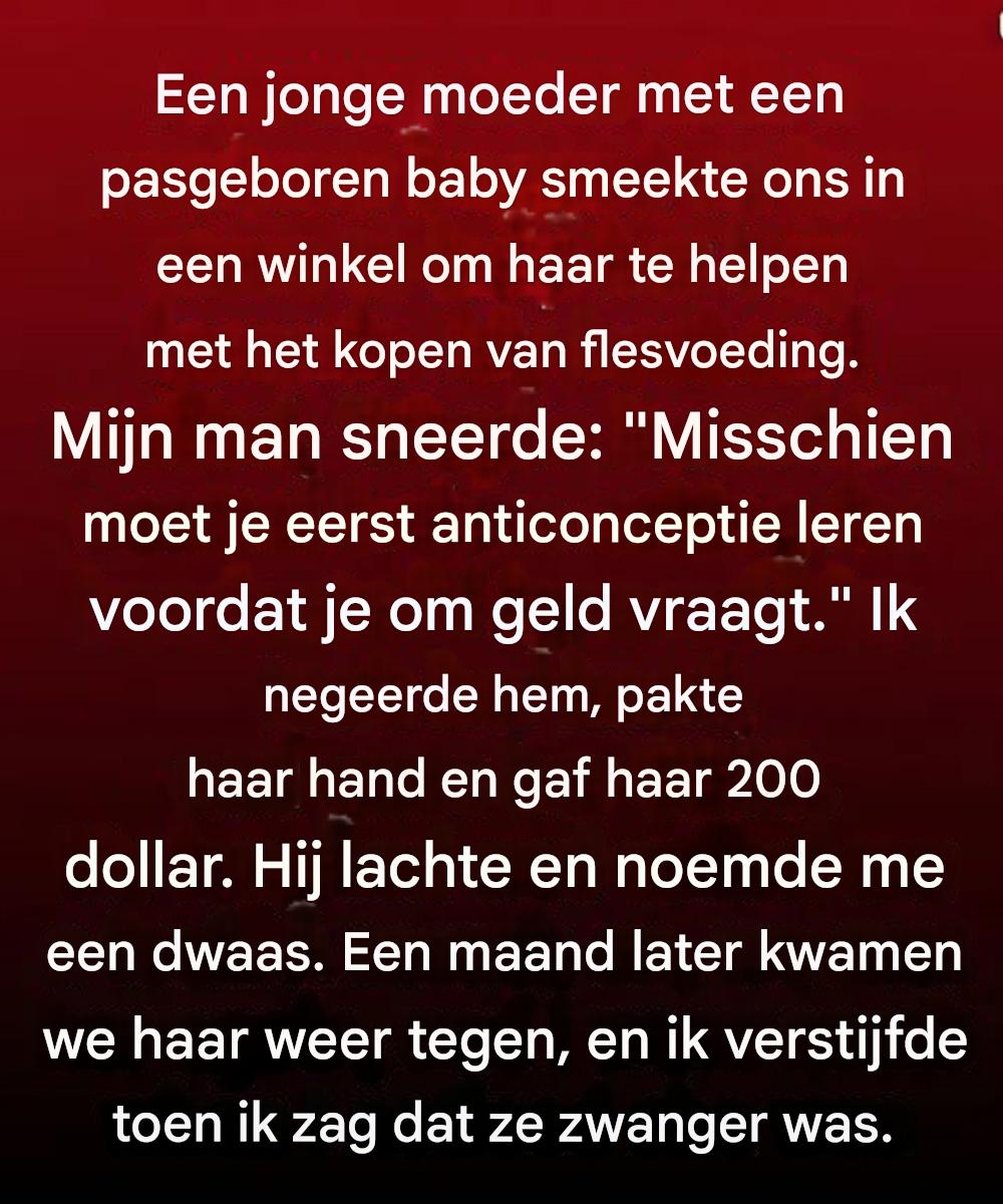 Ik kan me het zachte gezoem van de tl-lampen in dat kleine winkeltje nog steeds herinneren, een constante achtergrond bij wat voelde als een volkomen gewone dag. Bij de baby-afdeling stond een jonge vrouw met een pasgeboren baby zachtjes tegen haar borst gedrukt.