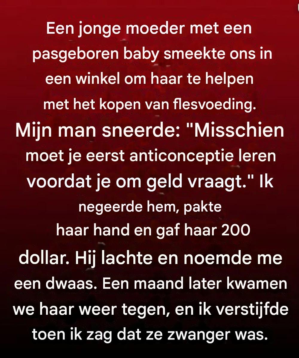 Ik kan me het zachte gezoem van de tl-lampen in dat kleine winkeltje nog steeds herinneren, een constante achtergrond bij wat voelde als een volkomen gewone dag. Bij de baby-afdeling stond een jonge vrouw met een pasgeboren baby zachtjes tegen haar borst gedrukt.