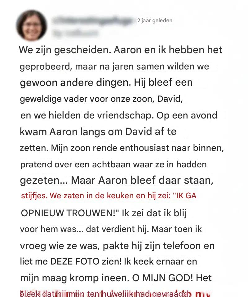 We zaten aan de keukentafel en na een diepe zucht zei hij: « Ik ga opnieuw trouwen. »