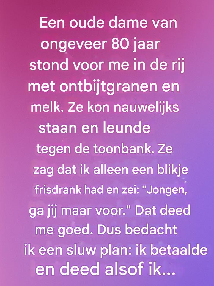Ik betaalde voor mijn frisdrank en deed alsof ik met mijn portemonnee aan het rommelen was, terwijl ik in mijn zakken tastte alsof ik iets belangrijks vergeten was. Ik stapte opzij, maar bleef staan. Vanuit mijn ooghoek keek ik haar na. Haar handen trilden lichtjes toen ze de cornflakesdoos verplaatste. Haar glimlach was niet geforceerd – het was de glimlach die voortkomt uit een leven lang onnadenkend voor vriendelijkheid kiezen.