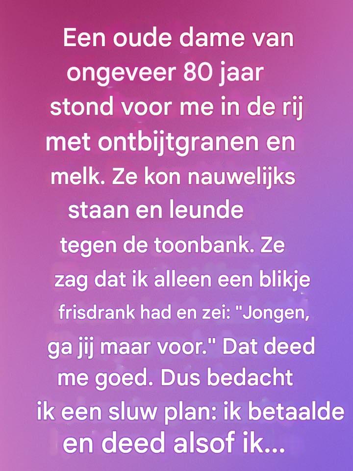 Ze keek me toen aan, haar ogen glazig, haar lippen trillend tussen protest en dankbaarheid. En in die stille supermarkt realiseerde ik me iets simpels maar krachtigs:
