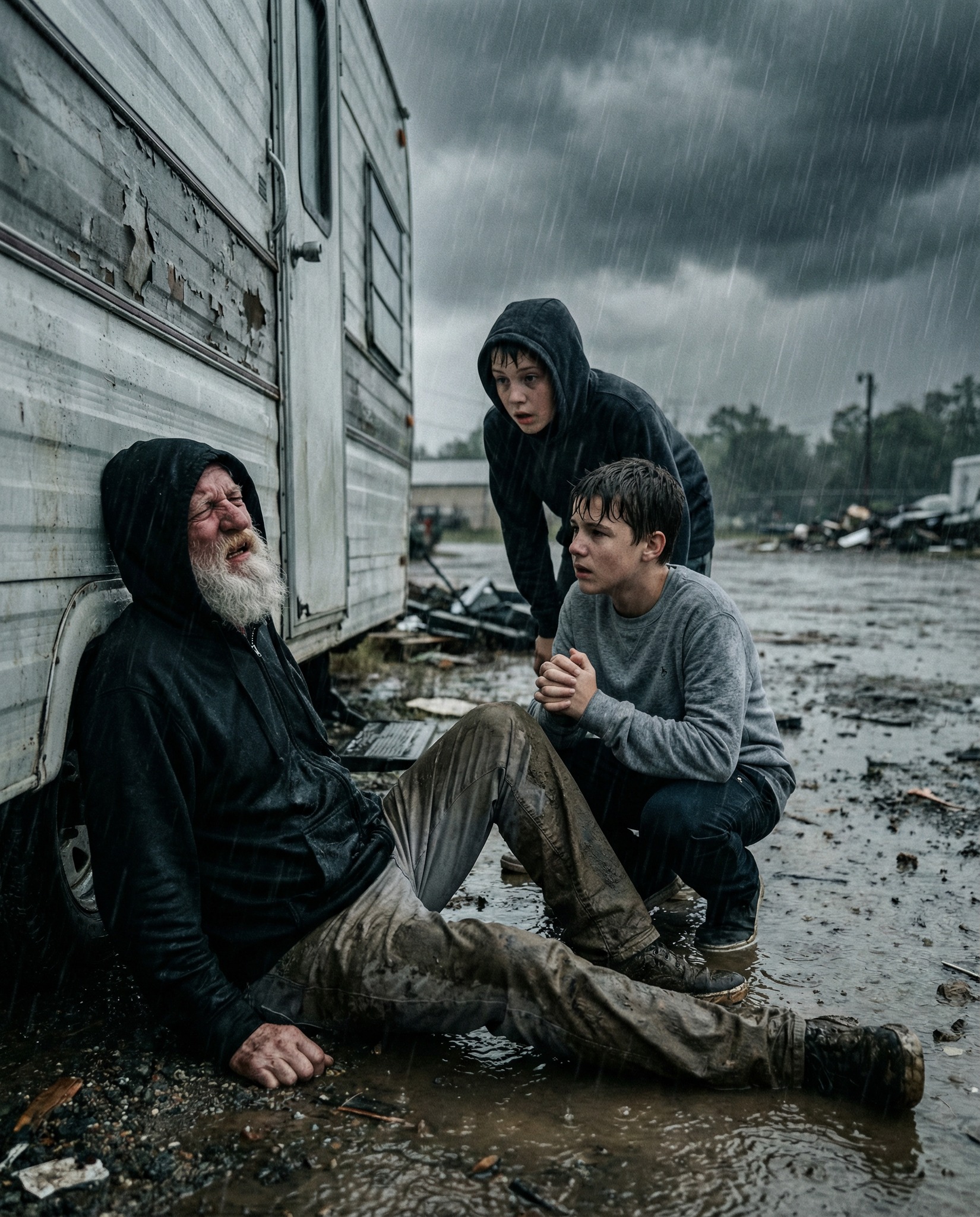 Ze stonden als versteend. Toen zagen ze een bejaarde man ineengedoken bij een helling zitten, zijn hand trillend in de lucht.