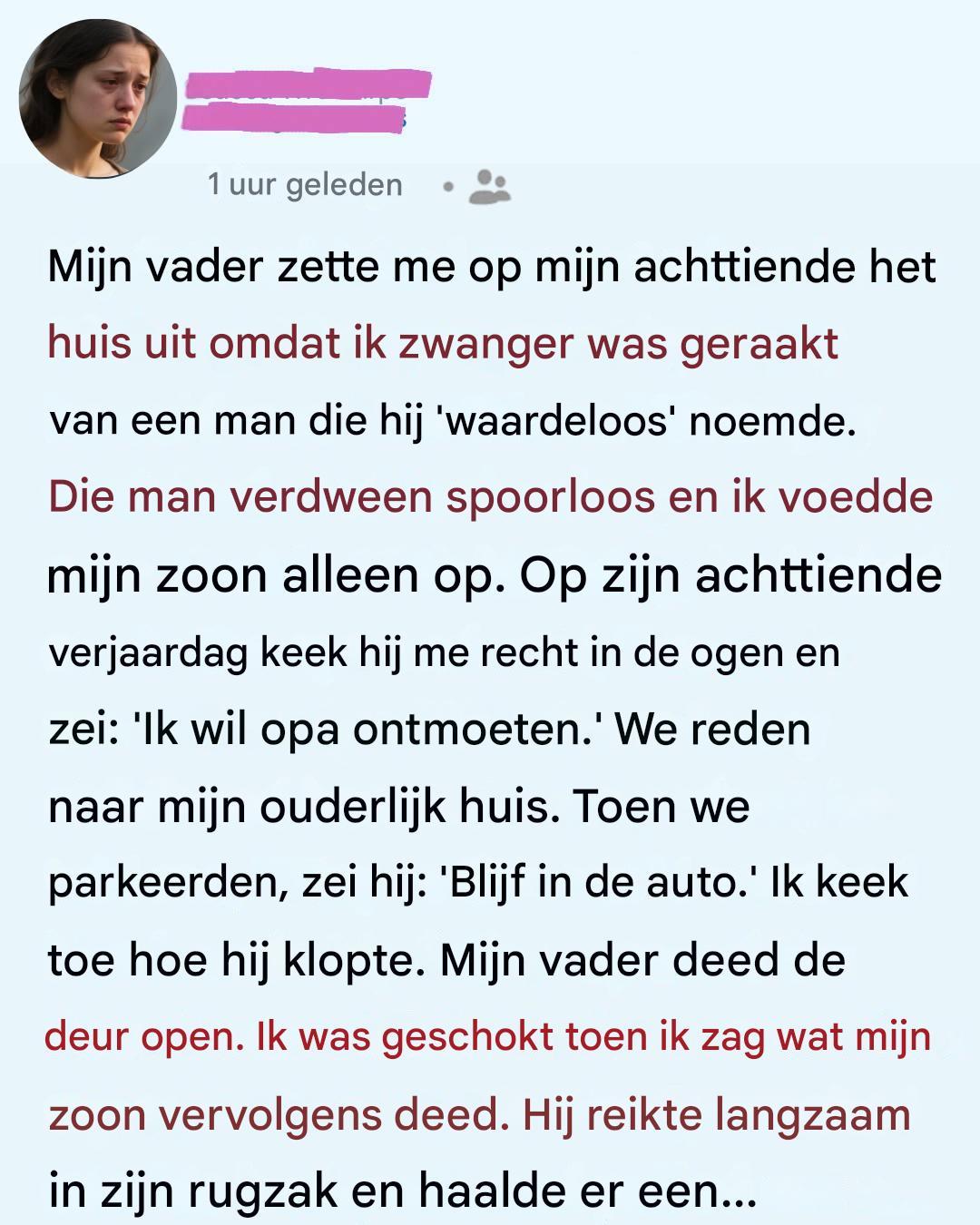 Mijn vader zette me op mijn achttiende het huis uit omdat ik zwanger was geraakt van een jongen die hij ‘waardeloos’ vond. Hij schreeuwde niet en maakte geen ruzie; hij wees gewoon naar de deur terwijl ik mijn kleren in een vuilniszak stopte, mijn groeiende buik vasthoudend en mijn zoon al in mijn buik voelend bewegen.