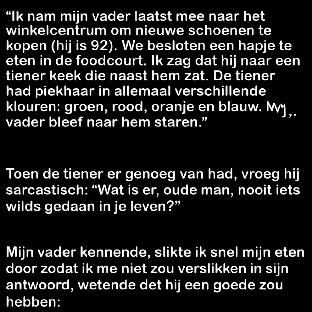 De zoon in kwestie besloot zijn hoogbejaarde vader mee te nemen naar het winkelcentrum. De man van 92 is nog goed bij de tijd, scherp van geest en gezegend met een flinke dosis droge humor. Al jaren weet hij mensen in zijn omgeving te verrassen met zijn gevatte opmerkingen – en die dag zou daar geen uitzondering op zijn.