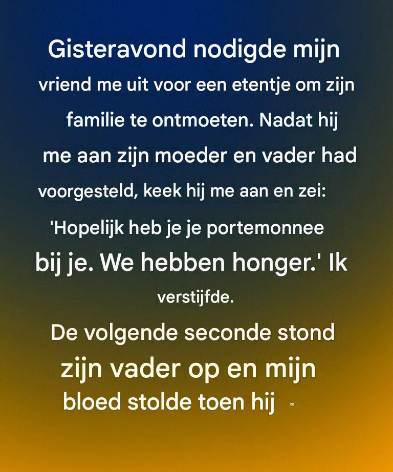 Nadat hij me aan zijn ouders had voorgesteld, draaide hij zich met een brede grijns naar me toe en zei: « Hopelijk heb je je portemonnee bij je, we hebben ontzettende honger. » Ik stond als versteend.