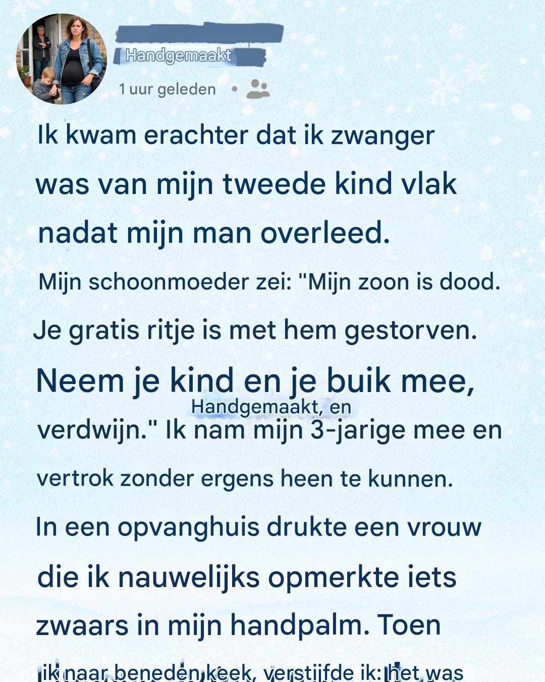 Verdriet kan de wereld leegmaken. Toen mijn man stierf, was de stilte in ons huis ondraaglijk – alsof de muren zelf waren gestopt met ademen. Ik was nog aan het bijkomen van de begrafenis toen ik ontdekte dat ik zwanger was van ons tweede kind. Het nieuws had een sprankje hoop moeten zijn, een herinnering dat het leven doorgaat, zelfs in de schaduw van de dood. Maar in plaats daarvan voelde het als een wrede speling van het lot.