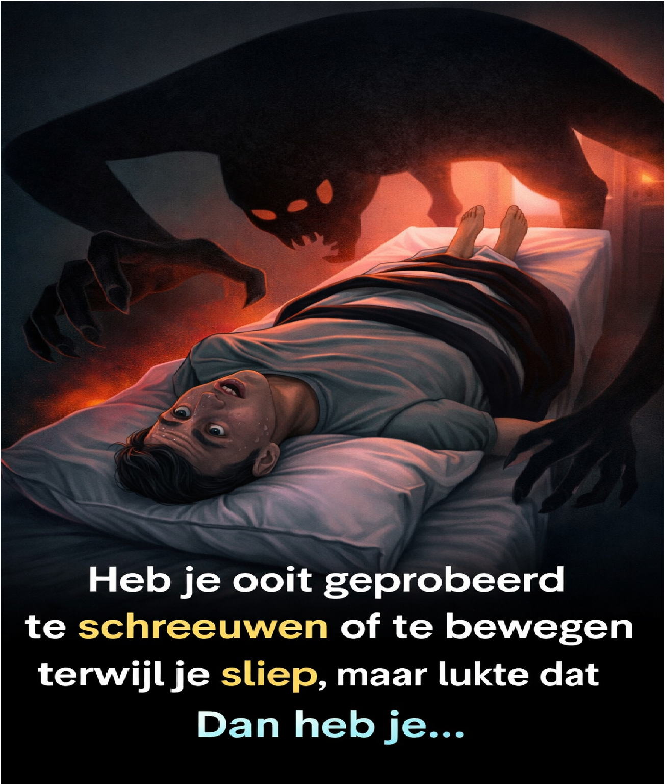 Een persoon ligt wakker in bed, ogen wijd open, zichtbaar in paniek. Boven hem hangt een donkere, dreigende schaduwfiguur met klauwen en gloeiende ogen. Dit “wezen” is geen toeval of symboliek alleen: veel mensen met slaapverlamming zien, voelen of horen iets vergelijkbaars. Het brein is wakker, maar zit nog half in de droomstand.