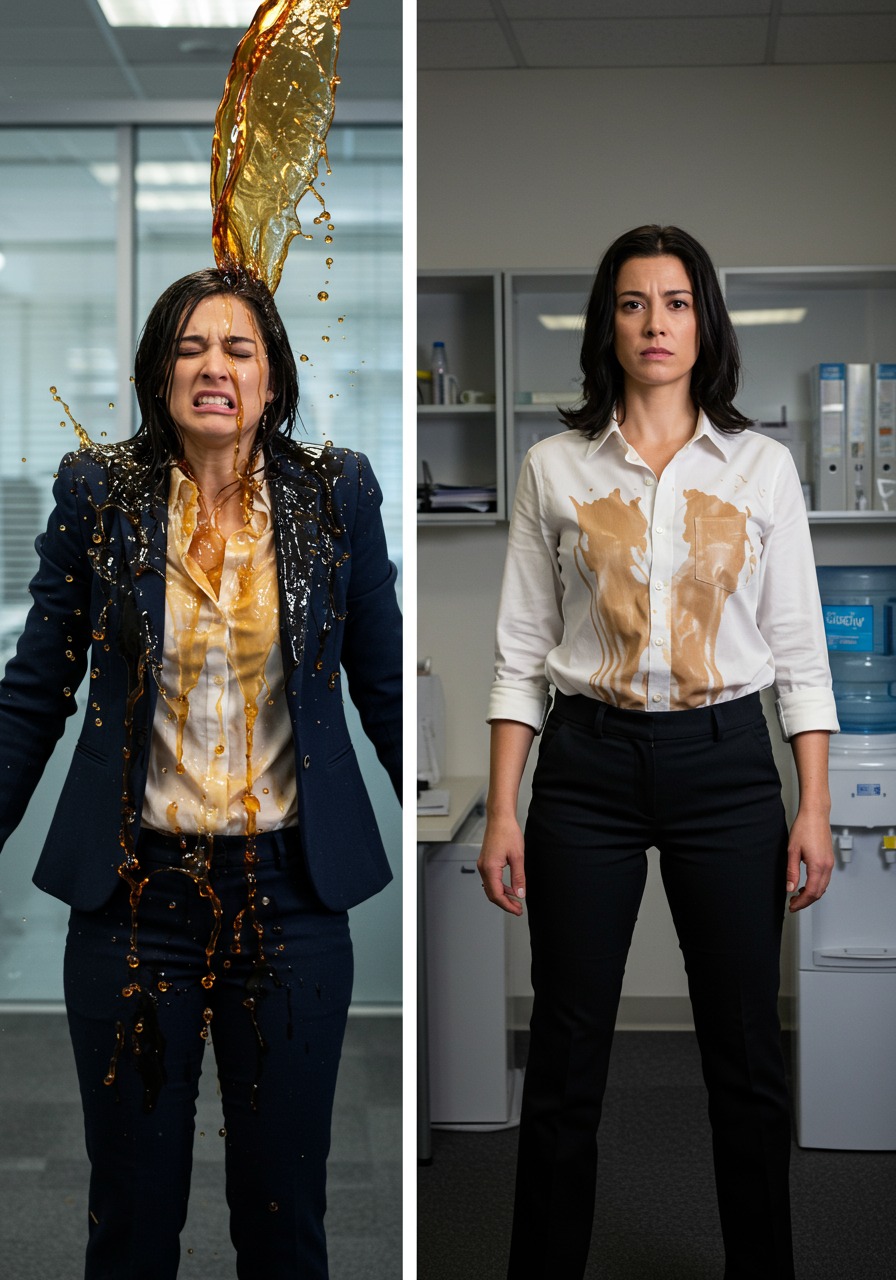 Bruine vloeistof druppelde van Nina Thompsons krullen en doorweekte haar marineblauwe blouse, terwijl het gelach van haar manager, Jessica Whitmore, door het kantoor van Apex Marketing galmde. « Oeps, ik dacht dat jij die middelmatige ideeën nieuw leven in moest blazen, » snoof Jessica, terwijl ze een leeg blikje Coca-Cola op Nina’s bureau gooide.