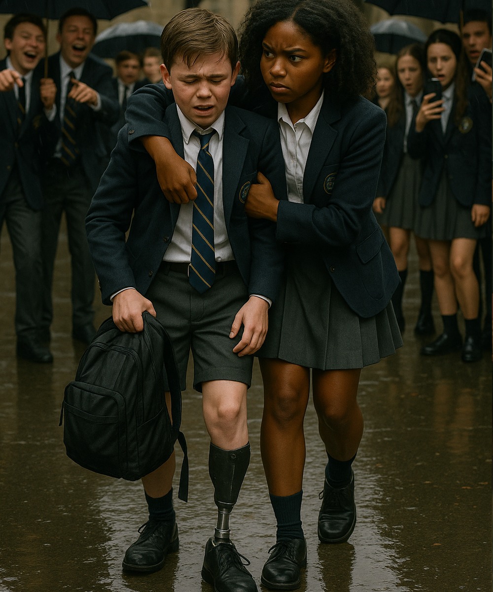 De twaalfjarige Leo Thompson klemde zich vast aan de riemen van zijn rugzak en liep door. Zijn strakke witte overhemd en getailleerde blazer konden het onregelmatige ritme van zijn stappen niet verbergen. Elke keer dat zijn prothese de grond raakte, volgde een zacht, metaalachtig klikgeluid – een geluid waar zijn klasgenoten graag om spotten.
