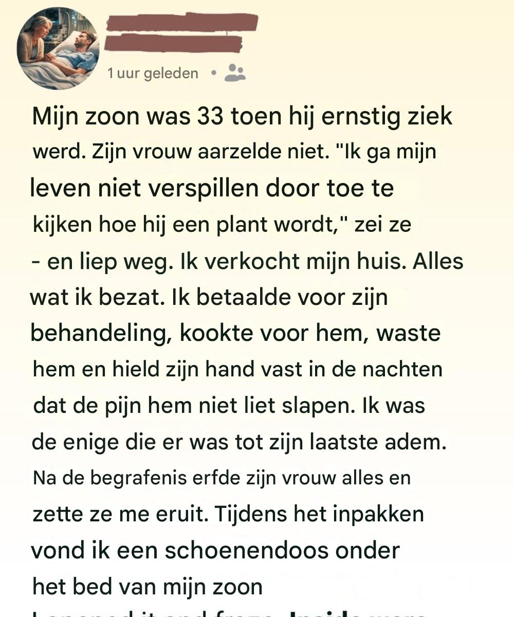 Zijn vrouw stond aan het voeteneinde van het ziekenhuisbed op de dag dat we de diagnose kregen. Ze huilde niet. Ze vroeg niet wat er gedaan kon worden. Ze kwam niet dichterbij toen de apparaten hun zachte, mechanische ritme begonnen.