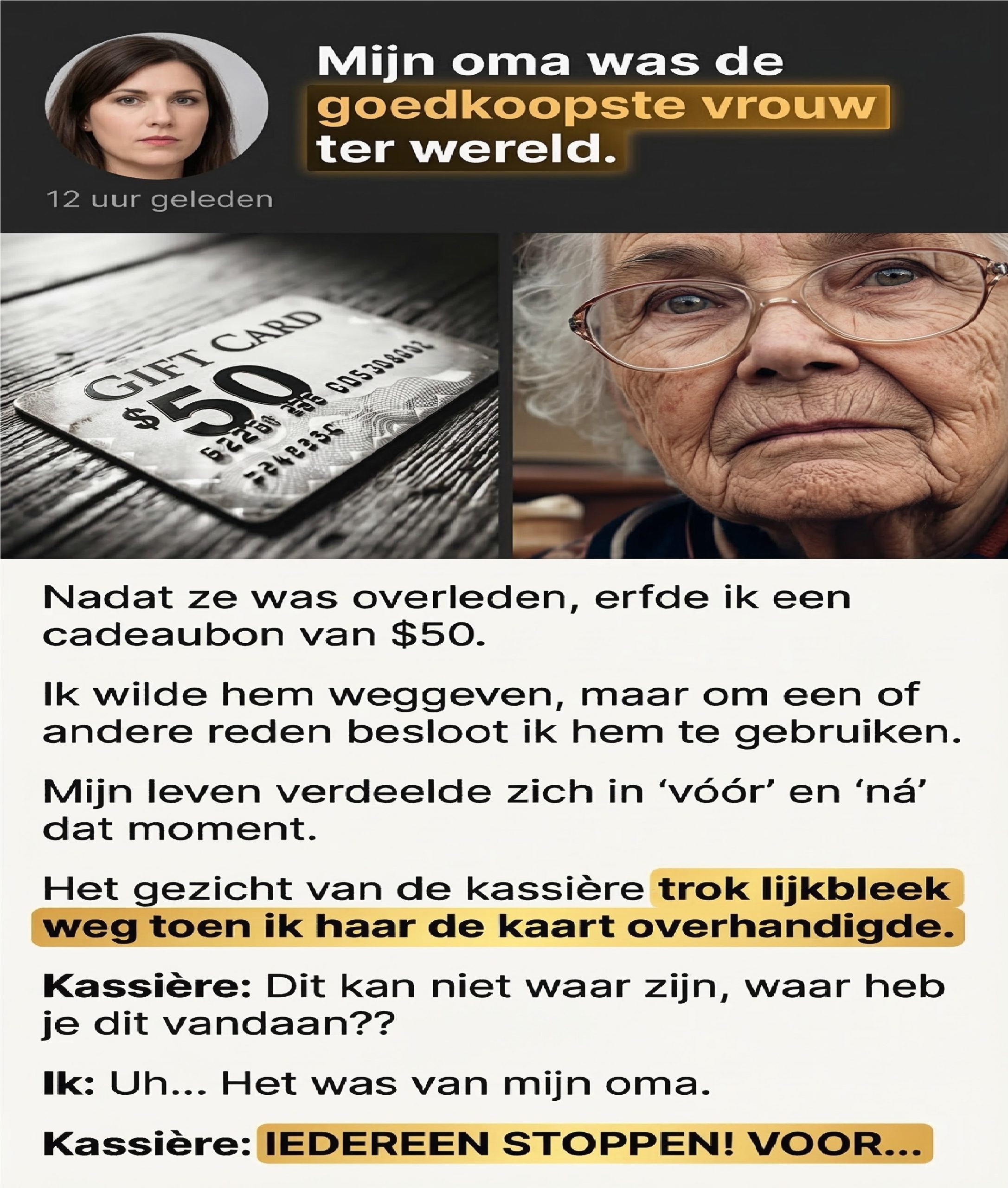 Toen veranderde alles. De handen van de kassière trilden toen ze de kaart aannam. Haar ogen werden groot, haar gezicht werd plotseling bleek. ‘Dit kan niet kloppen,’ fluisterde ze. ‘Waar heb je dit vandaan?’