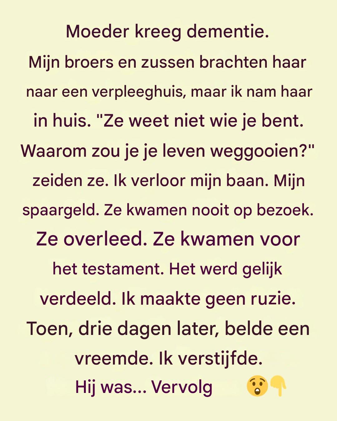 Ik had geen slim antwoord. Het enige wat ik wist, was dat toen mijn moeder me aankeek – verward, bang, zoekend – ze mijn hand pakte. En zo bracht ik haar naar huis.