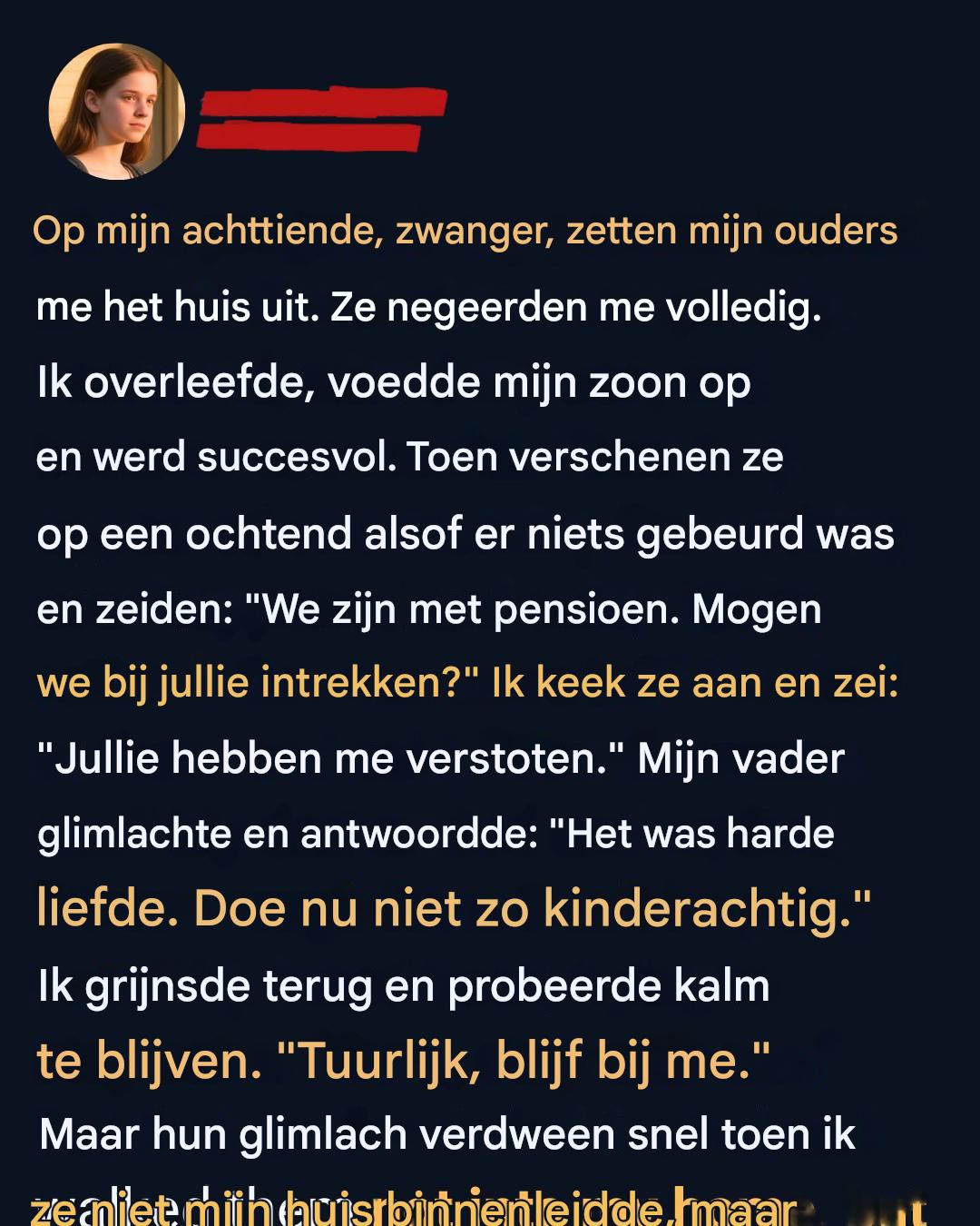 Ik was achttien, doodsbang en zwanger toen mijn ouders me vertelden dat ik moest vertrekken. Geen discussie. Geen woordenwisseling. Gewoon een koud, verbijsterend ultimatum: « Je hebt het er zelf naar gemaakt. » De deur sloeg achter me dicht en ik herinner me dat ik op de veranda stond met één rugzak, één kloppend hartje in mijn buik en het besef dat de mensen die me hadden opgevoed me zojuist hadden uitgewist.